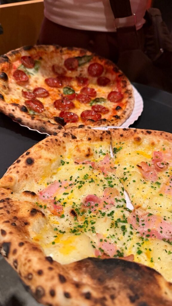 As pizzas individuais seguem o estilo neo-napolitano e são preparadas no forno elétrico Izzo, feito à mão em Nápoles e capaz de atingir 600 °C. Em cerca de 90 segundos, a massa leve e elástica ganha as clássicas manchas escuras nas bordas, conhecidas como “pontos de leopardo”.
