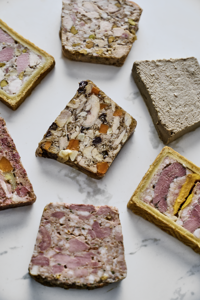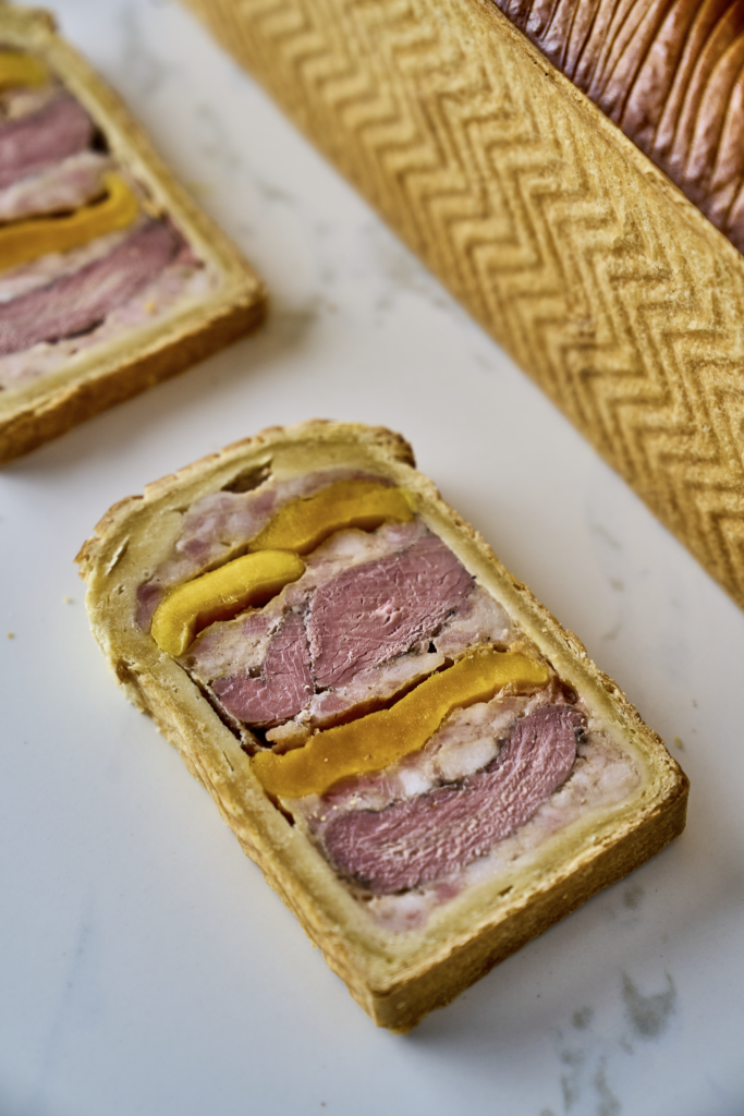 Patrimônio da charcuterie, o pâté en croûte consiste em uma terrine de carnes e vegetais envolta em massa amanteigada. O conjunto é então assado em temperatura controlada para se obter uma crosta firme e dourada, preservando a suculência do interior.
