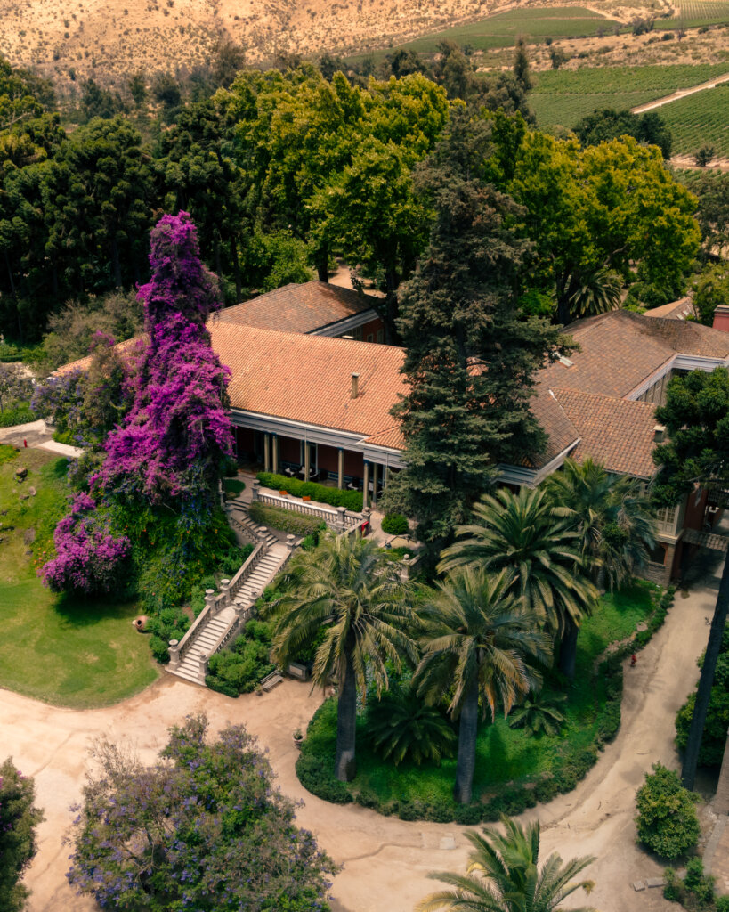 Já no Valle del Maipo, a experiência na Viña Santa Rita, conhecida no Brasil pela linha “120”, tem atmosfera mais clássica. A propriedade impressiona pela dimensão e pela preservação histórica. O Hotel Casa Real, instalado em um parque centenário ao lado de uma capela neogótica, surge entre jardins de inspiração europeia, lagos, esculturas e labirintos. Viajantes que recorrem o Chile do Atacama à Patagônia escolhem se hospedar ali para desacelerar antes de um longo voo para casa.