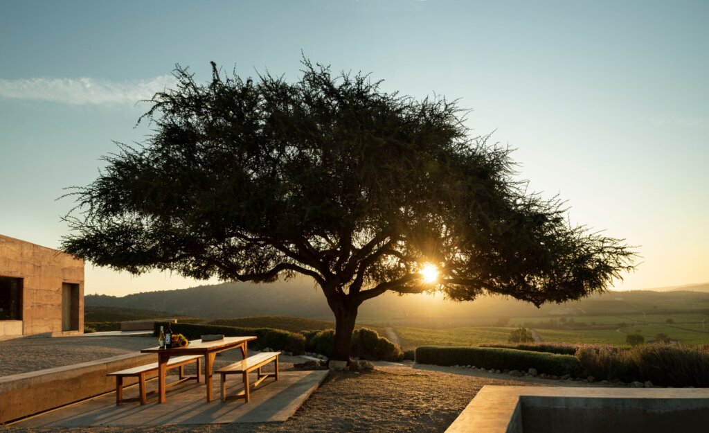 No Valle de Casablanca, a vinícola Casas del Bosque integra natureza, arquitetura e gastronomia de forma orgânica. O percurso começa na Casa Mirador, projeto de Matias Zegers, onde grandes molduras enquadram o horizonte de videiras. A degustação se inicia com o Sauvignon Blanc da linha Pequeñas, fresco e mineral, e segue até a cave e a horta que abastece o restaurante Botanico. À mesa, o tomate preto “black beauty”, recém-colhido, revela intensidade e acidez, acompanhado pelo tinto ícone da casa, “La Trampa”, um blend de Syrah, Malbec e um toque de Pinot Noir, estruturado e elegante.